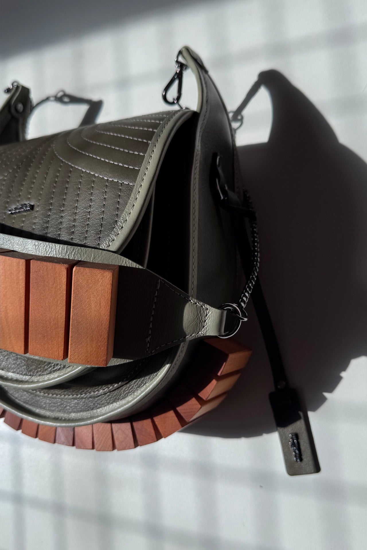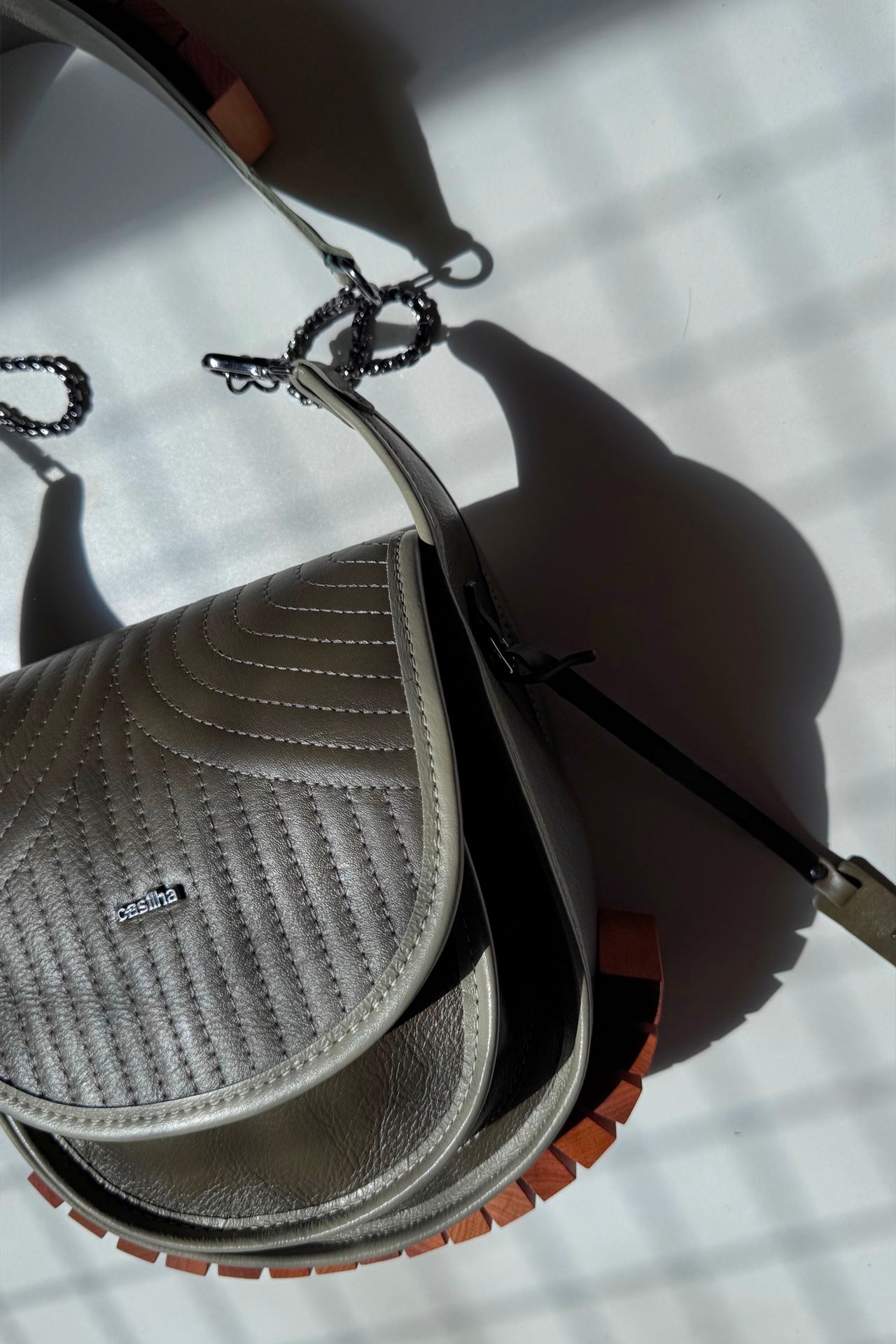 Produzida manualmente em couro legítimo, a Bolsa Restinga, além da alça de corrente com detalhes em madeira de Peroba Rosa, possui outra alça lisa opcional, com ampla regulagem de altura, podendo ser usada mais curtinha sobre o ombro ou com bastante transpasse. Possui 2 compartimentos, sendo o frontal pequeno, para acomodar os menores itens. Fechamento por botão imã com forte adesão.