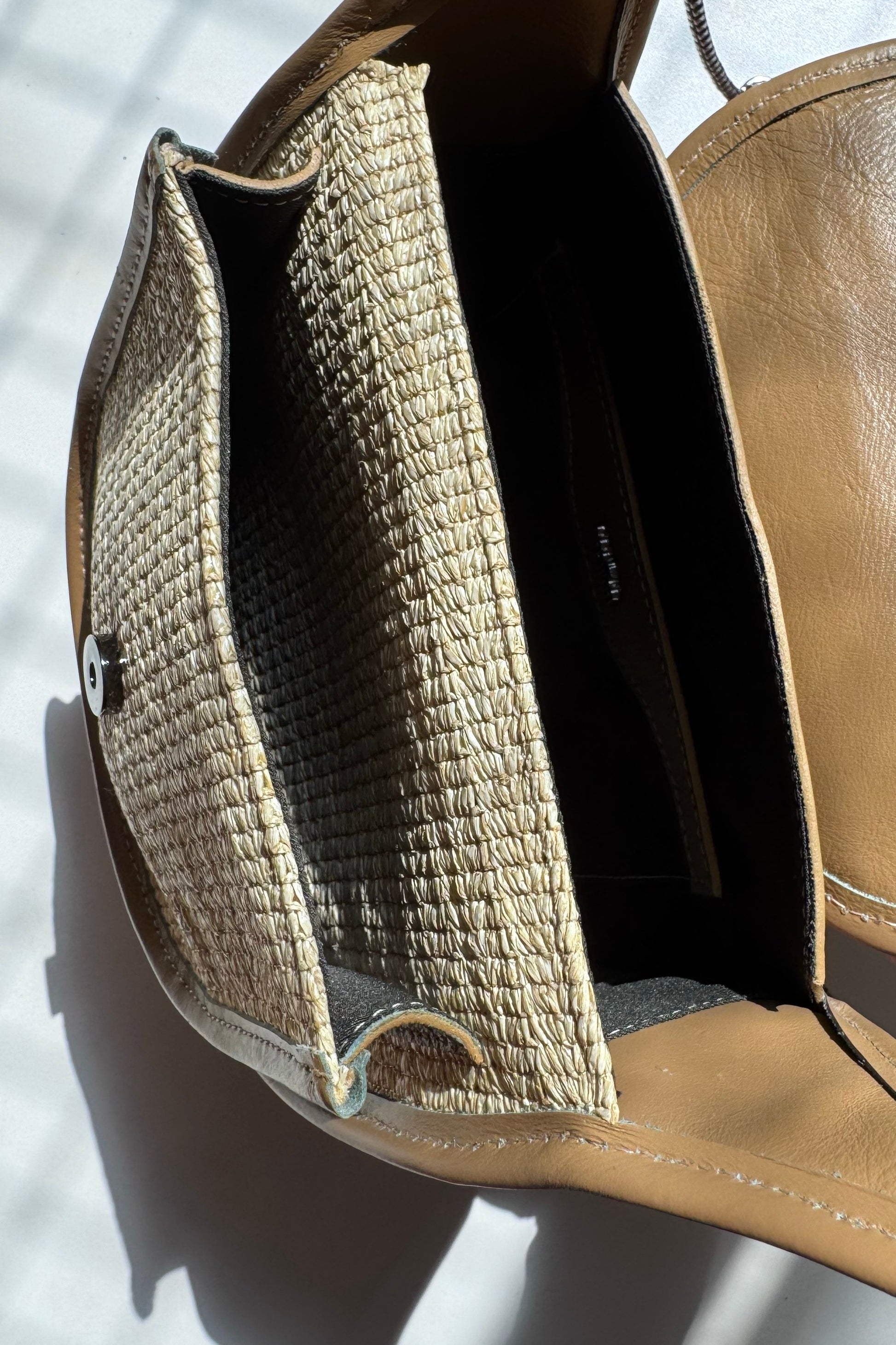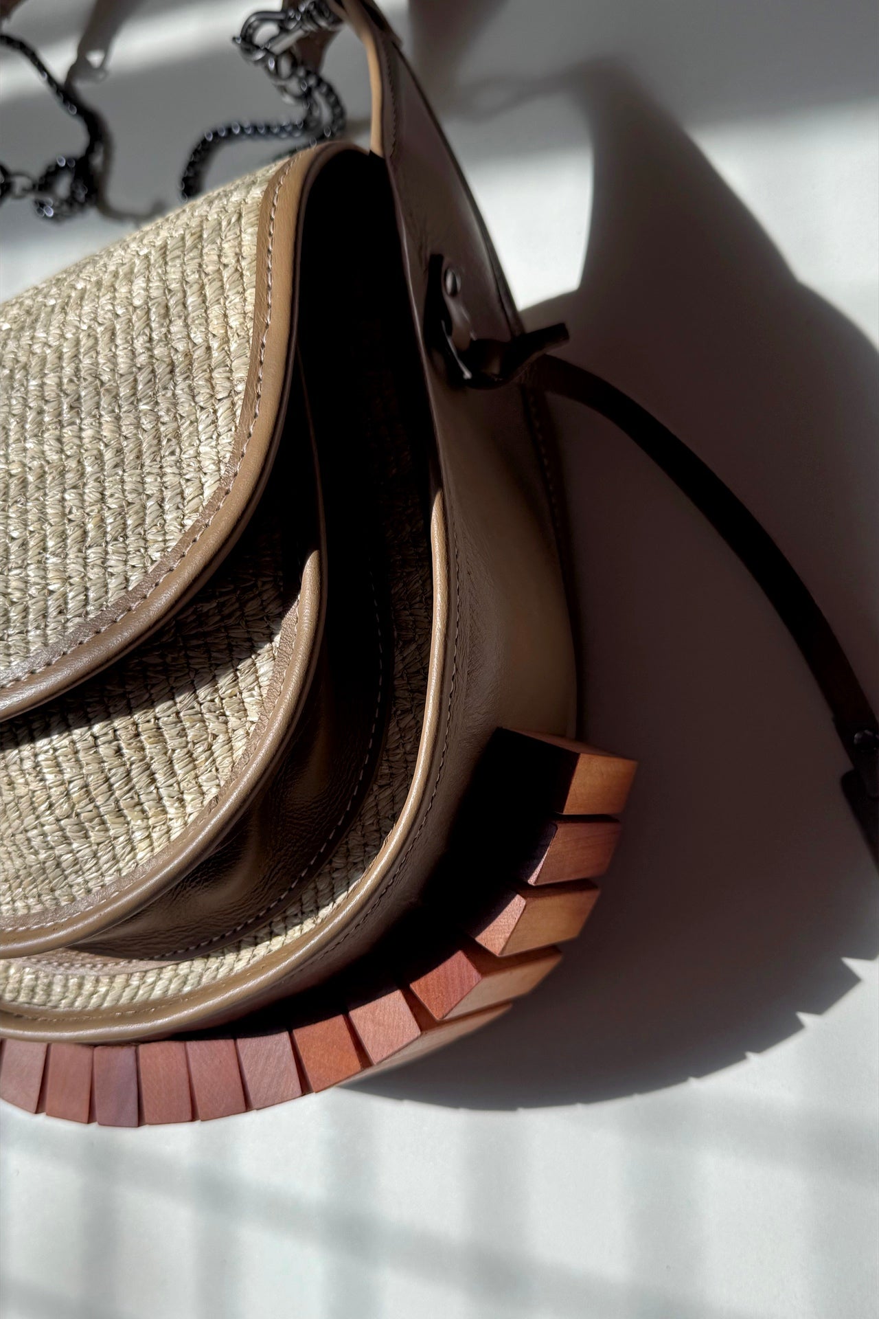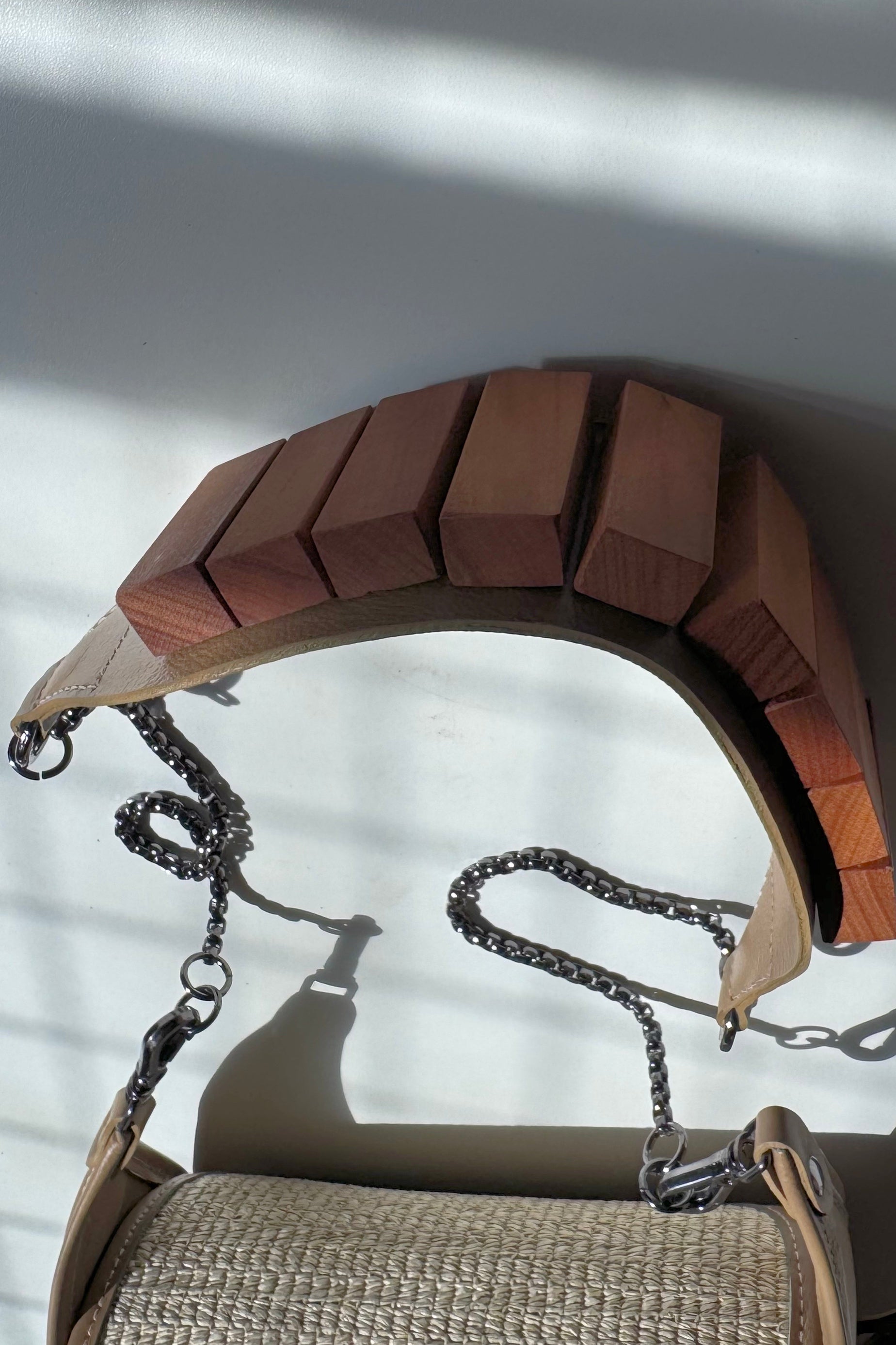 Produzida manualmente em couro legítimo, a Bolsa Restinga, além da alça de corrente com detalhes em madeira de Peroba Rosa, possui outra alça lisa opcional, com ampla regulagem de altura, podendo ser usada mais curtinha sobre o ombro ou com bastante transpasse. Possui 2 compartimentos, sendo o frontal pequeno, para acomodar os menores itens. Fechamento por botão imã com forte adesão.