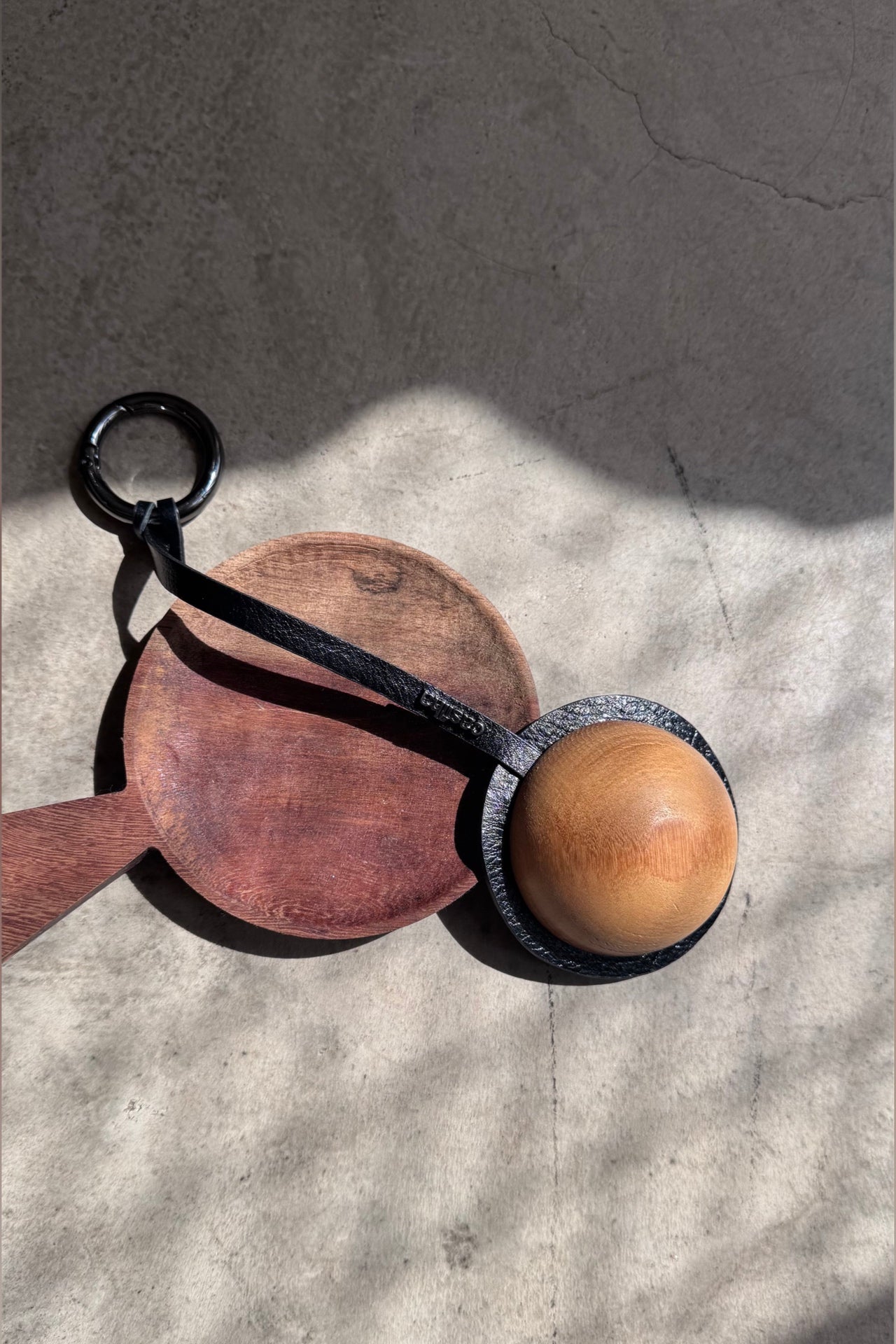 Produzido manualmente em couro legítimo, o Charm Esfera tem seu detalhe em madeira.