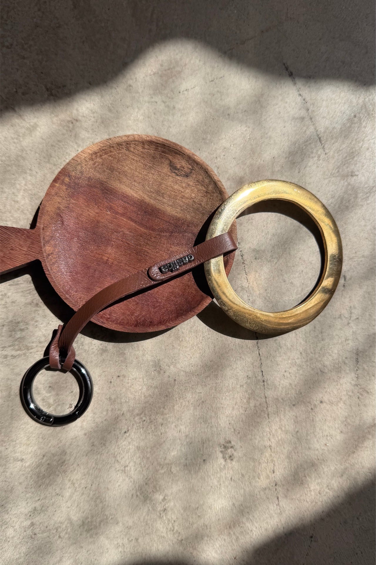 Produzido manualmente em couro legítimo, o Charm Orbe tem seu detalhe em latão e pode também ser usado como chaveiro por ser bem leve.