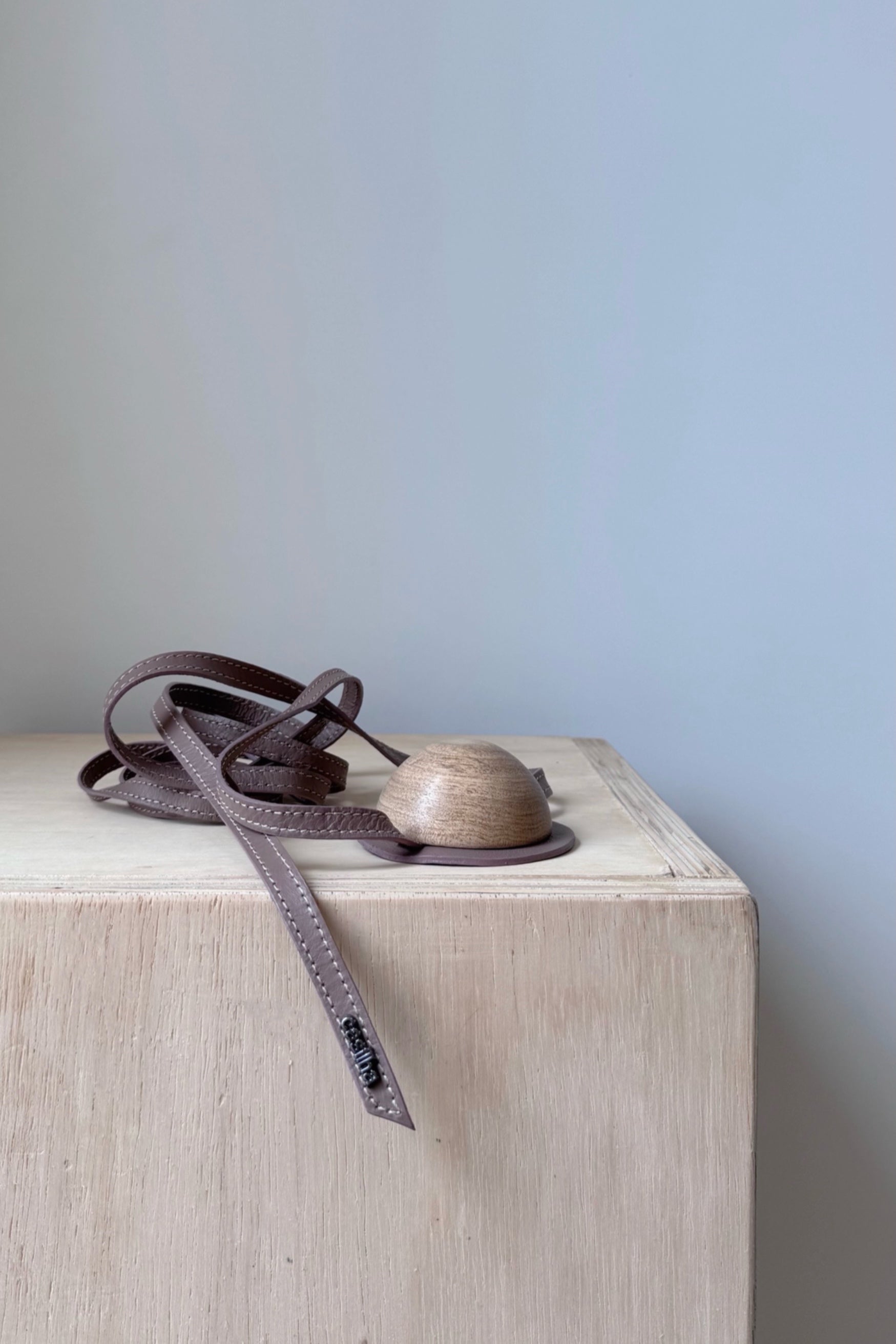 Produzido manualmente em couro legítimo, nosso Cinto Faixa Esfera tem como detalhe central a clássica assinatura da marca: a meia esfera de madeira.