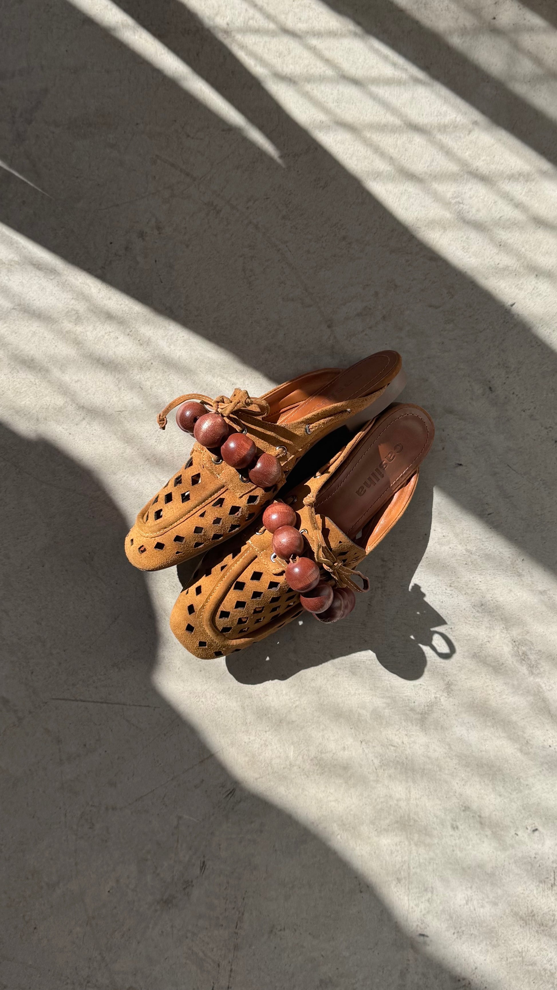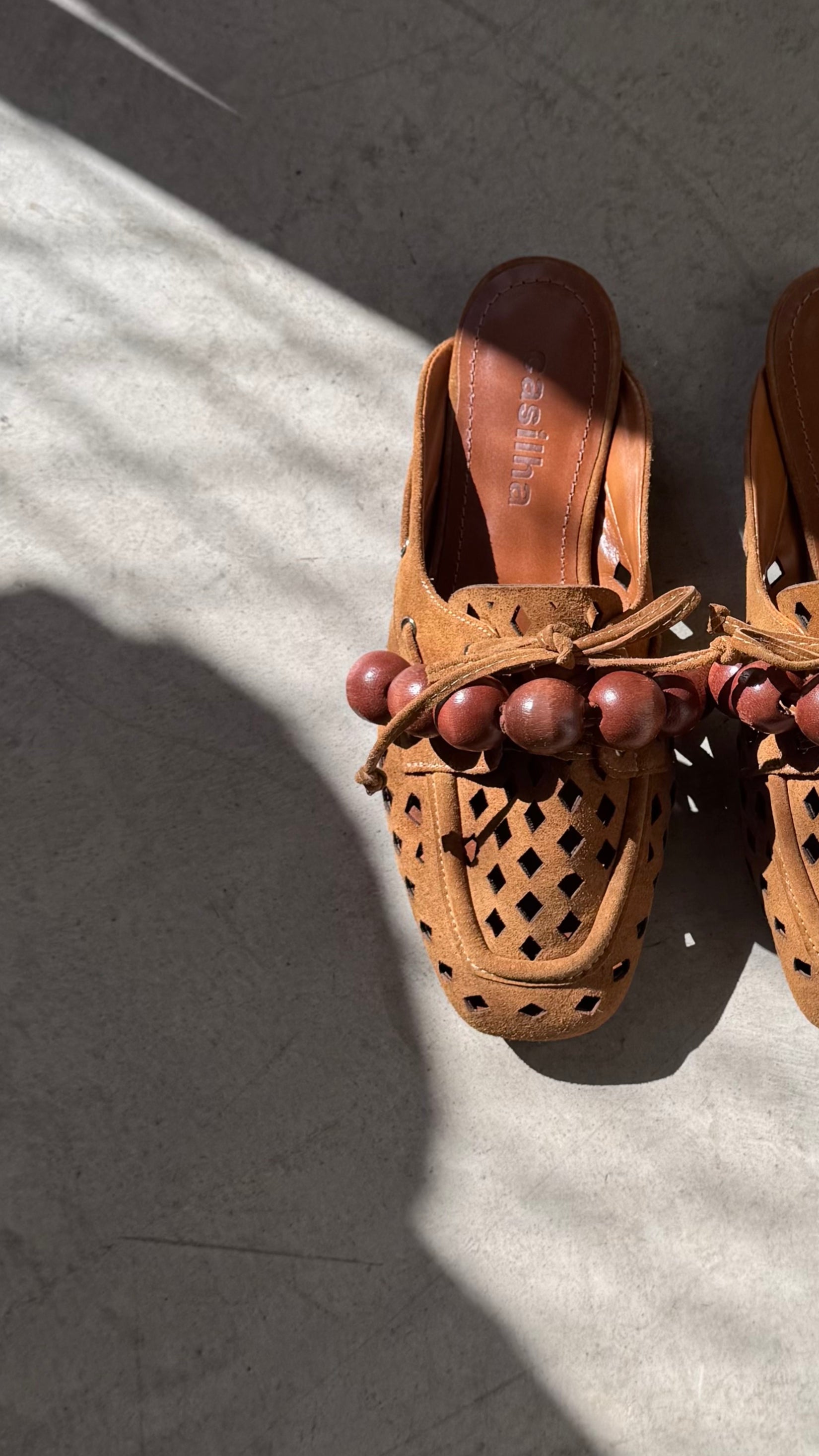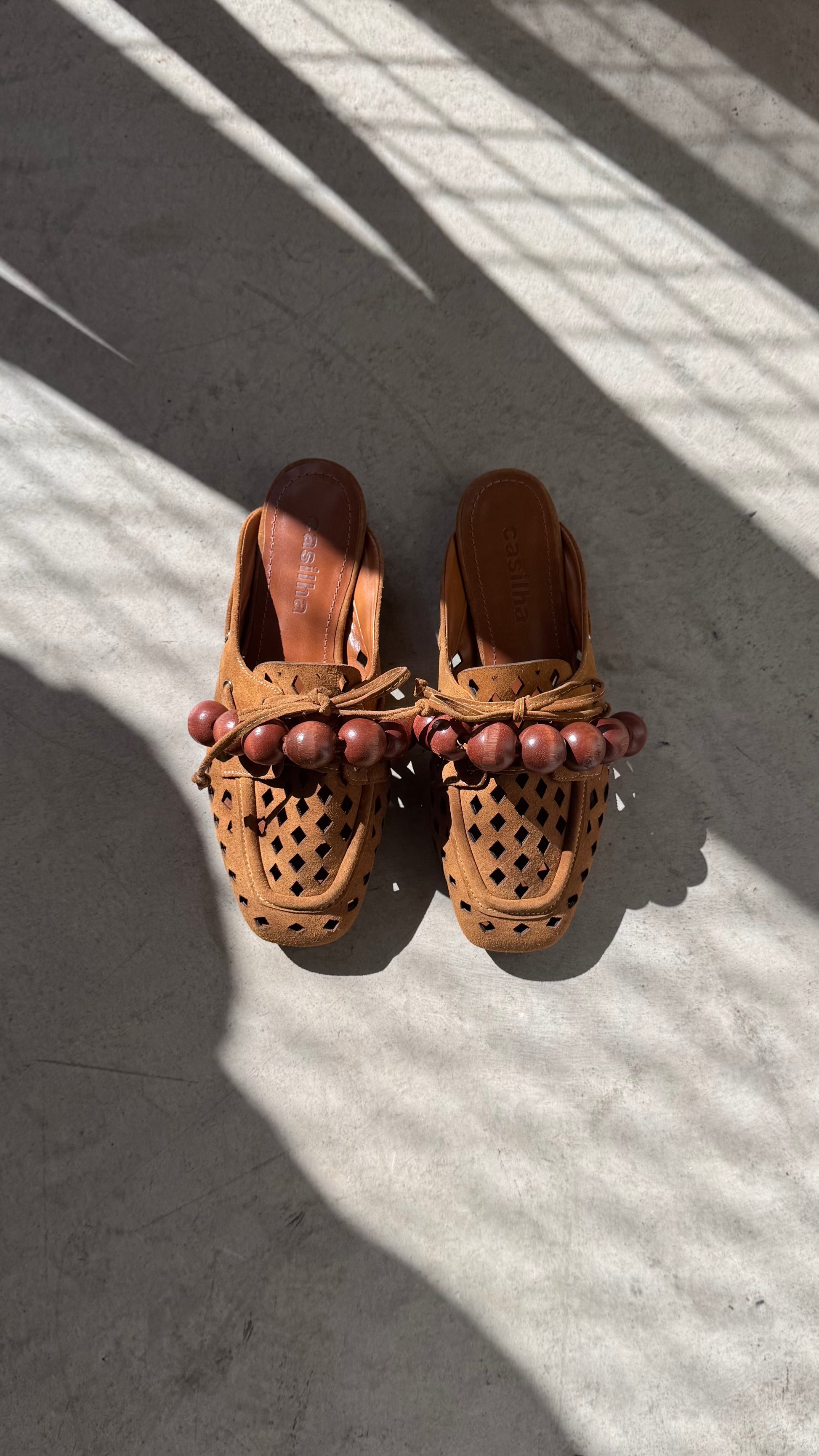 Palmilha forrada em couro legítimo ocre. Forração: material sintético.