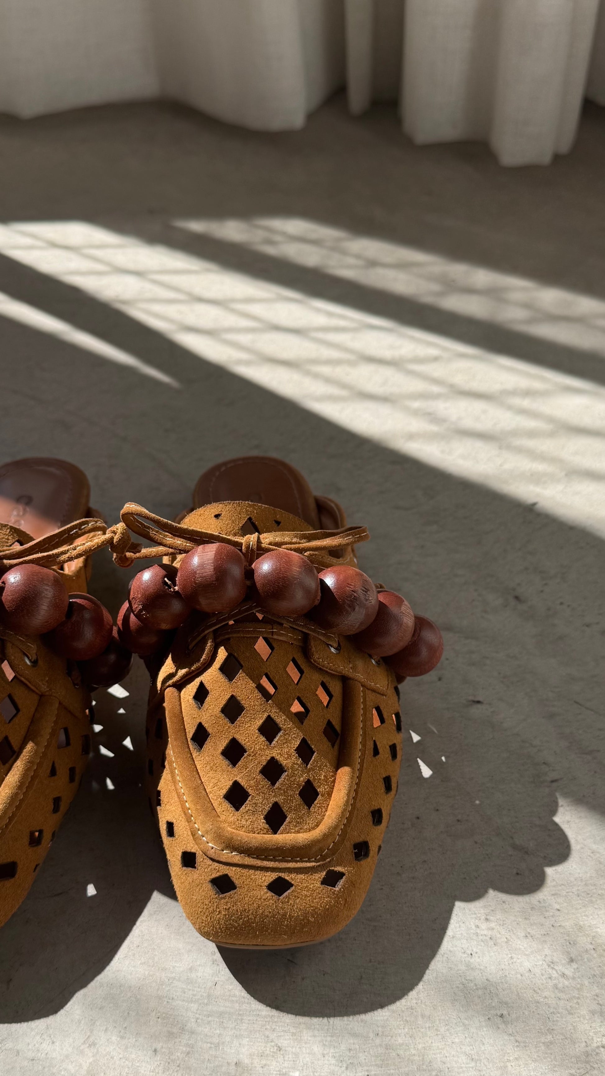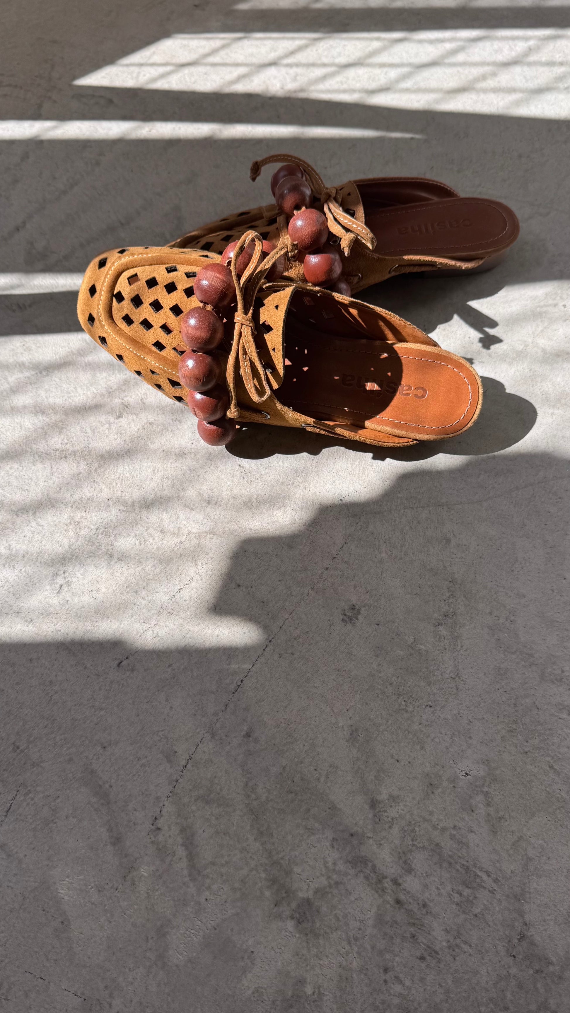 Produzida manualmente em couro legítimo e esferas de madeira pinus pintada.